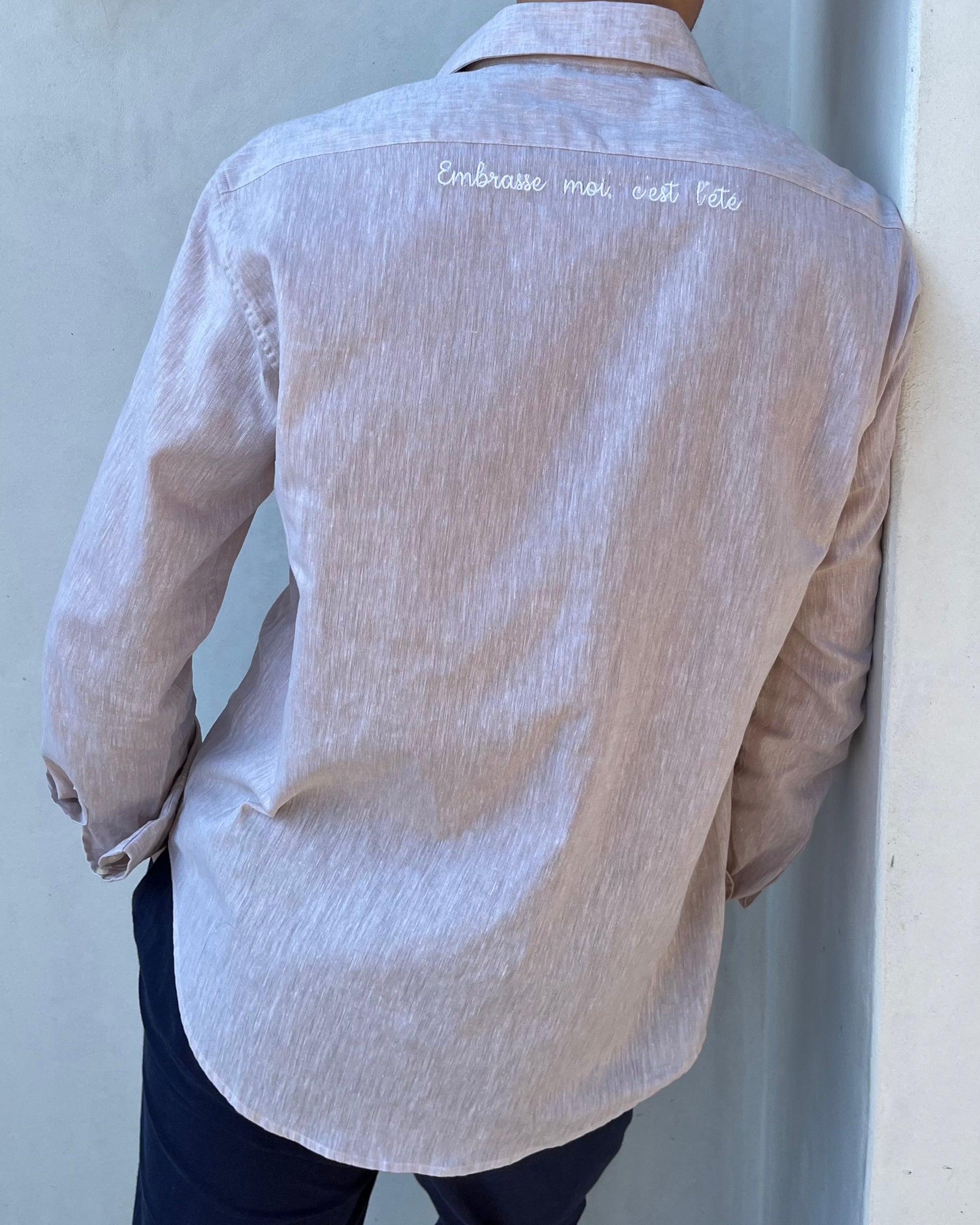 Nous créons des chemises en lin brodées et des tee-shirts floqués, en édition limitée, avec des mots et des phrases qui capturent l’essence d’un été dans le Sud.