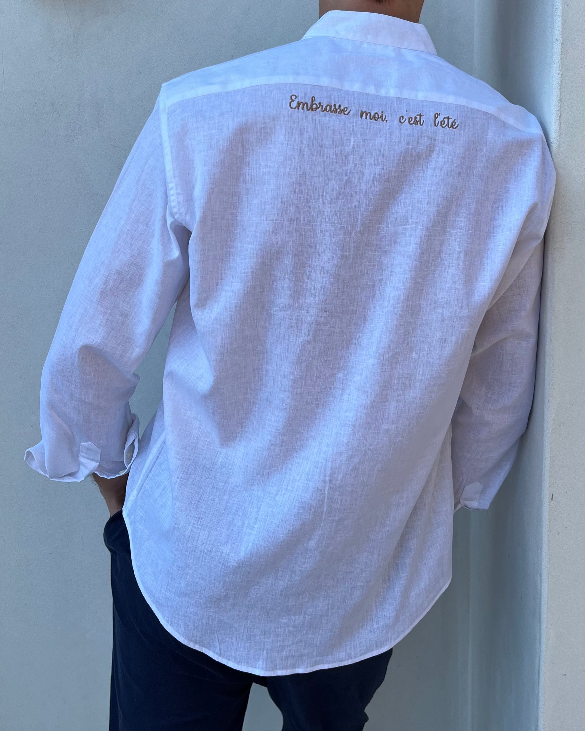 Nous créons des chemises en lin brodées et des tee-shirts floqués, en édition limitée, avec des mots et des phrases qui capturent l’essence d’un été dans le Sud.
